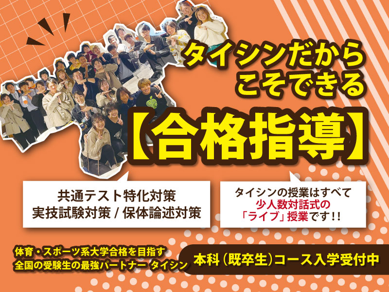 体育・スポーツ系大学専門予備校として44年の実績を誇る体育進学センター(タイシン)が入試直前までサポートします。保体論述・実技の本番で1点でも多く得点できるように、アドバイスの会で不安をなくしておこう!!
