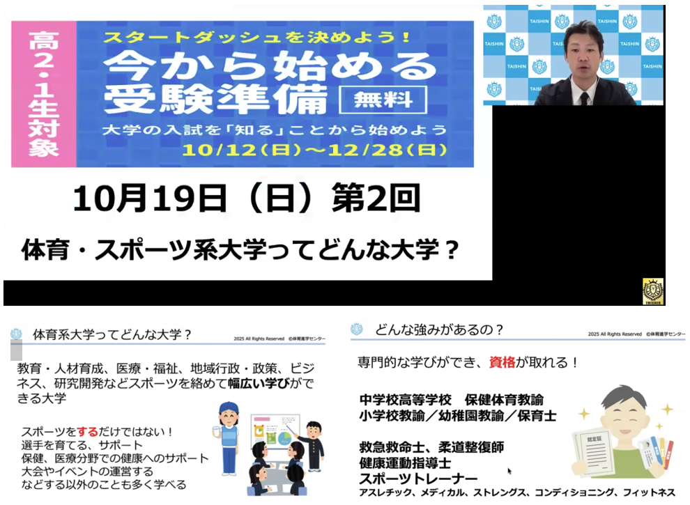 タイシンでは、一人ひとりの受験生に、競技経験を得た経験を武器に年内入試で合格できるよう高校2年生・高校1年生向けの無料イベントを開催していきます。部活動で忙しい人に向けてアーカイブも準備していますのでぜひご利用ください。
