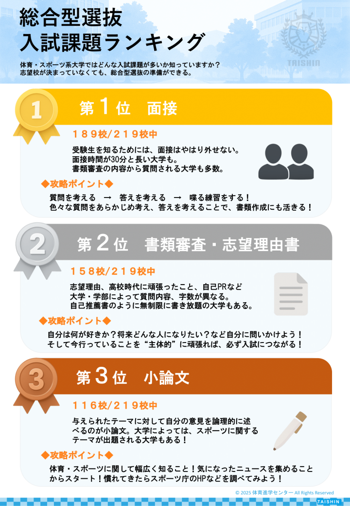 Vol.2総合型選抜 入試課題ランキング Point 体育・スポーツ系大学ではどんな入試課題が多いか知っていますか? 志望校が決まっていなくても、総合型選抜の準備ができる。 総合型選抜 入試課題ランキング.pdf 体育進学センター公式LINE 受験情報バックナンバー 生徒用 先生用 保護者用 タイシンへのご相談はこちら 個別相談詳細を見る お問い合わせ詳細を見る 資料請求・メールマガジン登録詳細を見る 入学説明会詳細を見る 受験に関するFAQ [国立/私立]体育系大学一般選抜に関するよくある質問(FAQ) 体育大学受験に関するよくある質問(FAQ) よくある質問(FAQ) 体育進学センター 本校 〒151-0072東京都渋谷区幡ヶ谷2-19-7 Flos幡ヶ谷1FTEL:03-5351-6301 FAX:03-5351-3600 体育進学センター 大阪校 〒530-0035大阪府大阪市北区同心1-1-26 ブリリアントタワー7FTEL:06-4301-5521 FAX:06-4301-5525