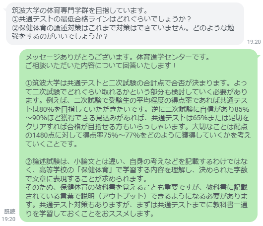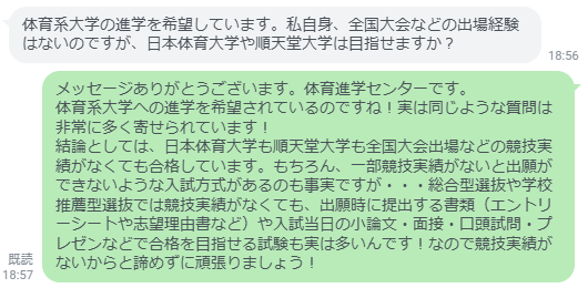 タイシン公式LINEでは、体育・スポーツ系大学進学に関する情報を週1回配信します。友達登録することで「自分に合った大学の選び方~受験対策」まで有益な情報が得られます!また、受験に対する悩みや質問もチャットで無料相談が可能です!