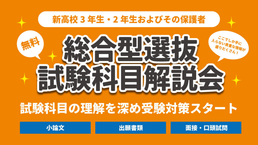 本イベントは、総合型選抜・学校推薦型選抜を検討している新高3生(現高校2年生)・新高2生(現高校1年生)の受験生と保護者を対象とした、試験科目への理解を深め、受験対策を始めるための試験科目別オンライン解説会です。