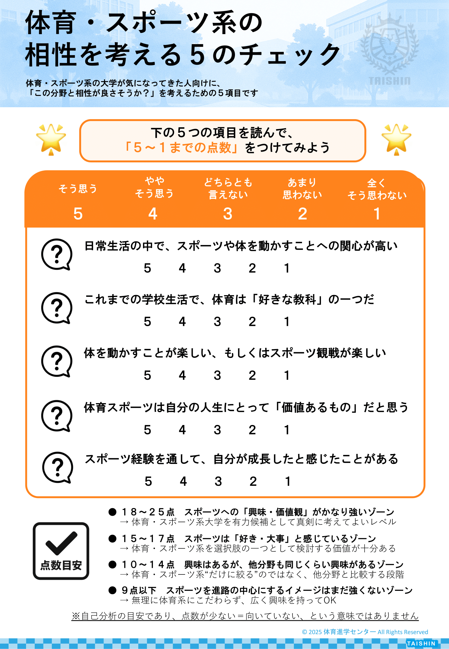 体育・スポーツ系の大学が気になってきた人向けに、「この分野と相性が良さそうか?」を考えるための5項目です。