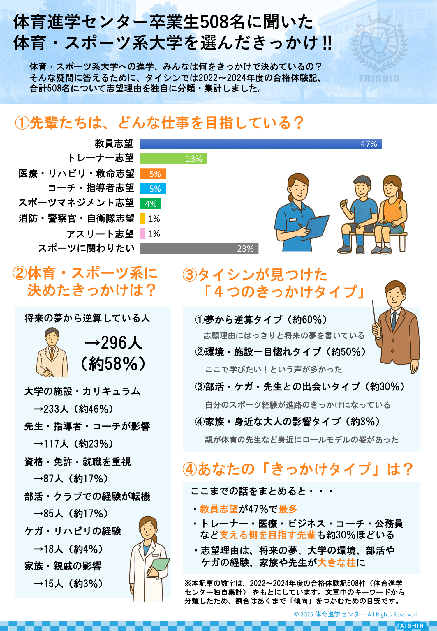 体育進学センター卒業生508名に聞いた体育・スポーツ系大学を選んだきっかけ! Point 体育・スポーツ系大学への進学、みんなは何をきっかけで決めているの?そんな疑問に答えるために、タイシンでは2022~2024年度の合格体験記、合計508名について志望理由を独自に分類・集計しました。 総合型選抜 入試課題ランキング.pdf 体育進学センター公式LINE 受験情報バックナンバー 生徒対象 先生対象 保護者対象 タイシンへのご相談はこちら 個別相談詳細を見る お問い合わせ詳細を見る 資料請求・メールマガジン登録詳細を見る 入学説明会詳細を見る 受験に関するFAQ [国立/私立]体育系大学一般選抜に関するよくある質問(FAQ) 体育大学受験に関するよくある質問(FAQ) よくある質問(FAQ) 体育進学センター 本校 〒151-0072東京都渋谷区幡ヶ谷2-19-7 Flos幡ヶ谷1FTEL:03-5351-6301 FAX:03-5351-3600 体育進学センター 大阪校 〒530-0035大阪府大阪市北区同心1-1-26 ブリリアントタワー7FTEL:06-4301-5521 FAX:06-4301-5525