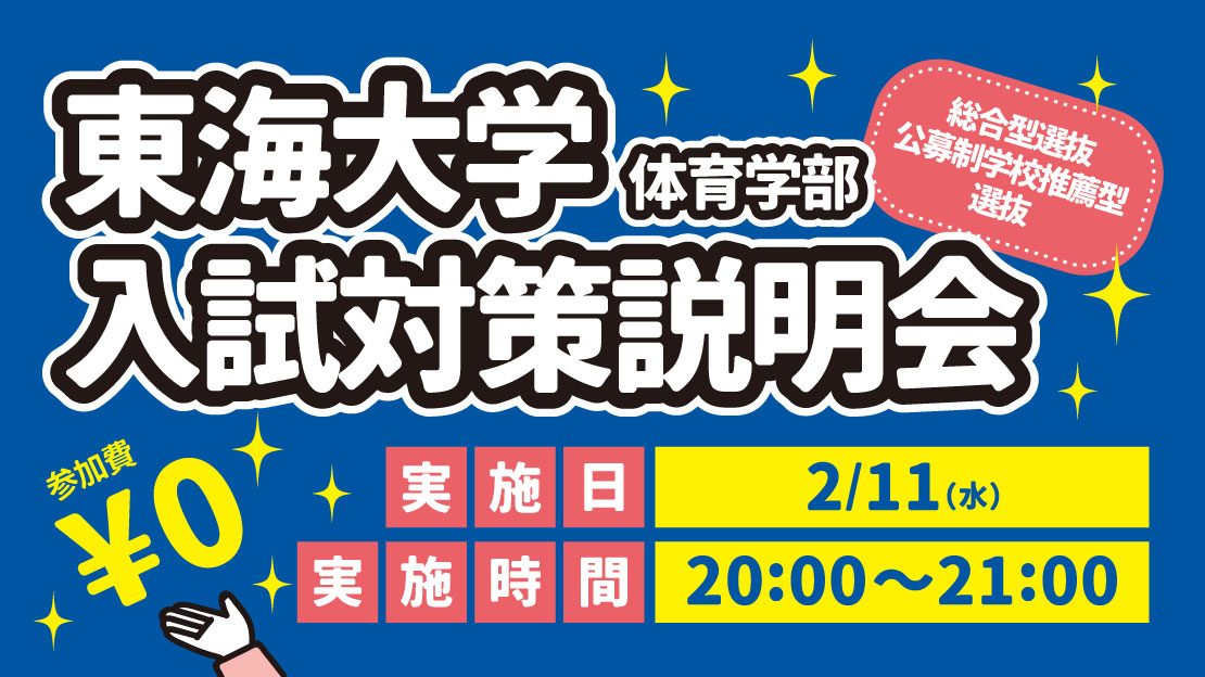 初めて受験を考える方から、出願直前の確認をしたい方まで、東海大学体育学部合格に向けた「今やるべき準備」が明確になる説明会です。