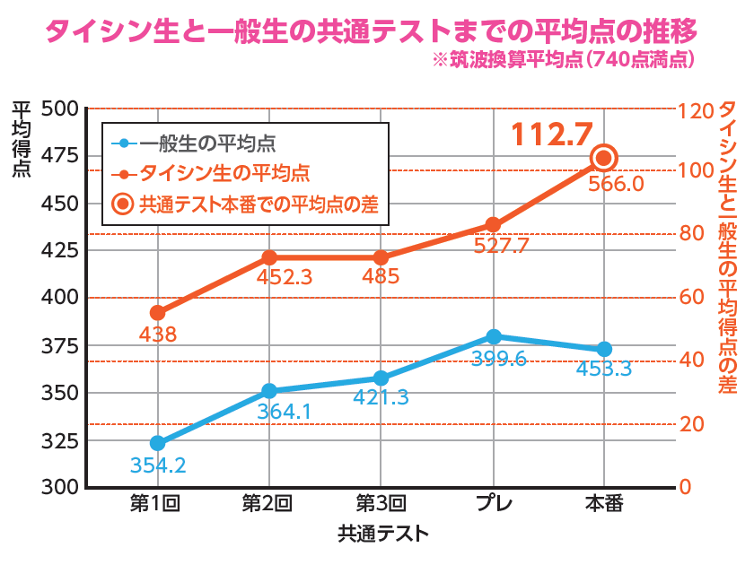 | 全体 453.3 /740点 | タイシン生平均 566.0 /740点 | 筑波志望者平均 503.0 /740点 |